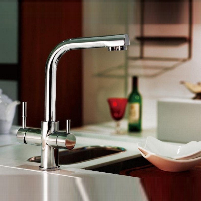 Питьевая вода и общий поток воды в нем, не смешиваясь, подаются через разные сопла в одном кране, что экономит место над раковиной.